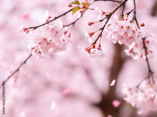 Soft pink sakura petals gently falling against a blurred background, traditional, delicate