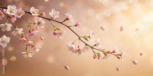 Soft pink sakura petals gently falling from a branch against a warm beige background, creating a delicate and serene atmosphere