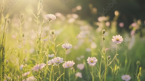 wildflower, pink, flower petals, meadow, sunlight, nature, flora, soft, blossom, greenery, serenity, growth, blooming, ray, field, botanical, spring, season, photo, landscape, floral, delicate, beautiful, sunshine, vibrant, peaceful, sunrise, softness, colourful, scenery, fresh, natural, morning, calmness, environment, joyful, scenic, bright, charming, lovely, light, peace, lush, organic, elegant, whimsical