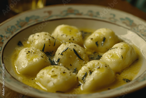 Soft Ricotta Gnocchi with Sage Butter Sauce on Rustic Plate, Warm Natural Lighting