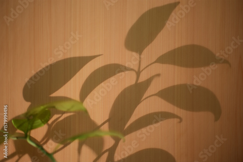 Soft shadow of a leafy plant cast on a warm wooden surface