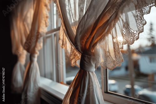 Soft sunlight filters through lace curtains in a cozy home setting during sunset