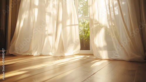Soft sunlight streaming through sheer curtains in a cozy room capturing warmth and serenity