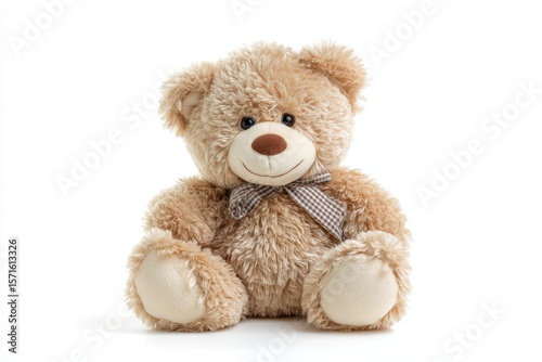 Soft teddy bear sitting on a white background, charming plush toy designed for children and a perfect gift for any occasion or decoration in a nursery