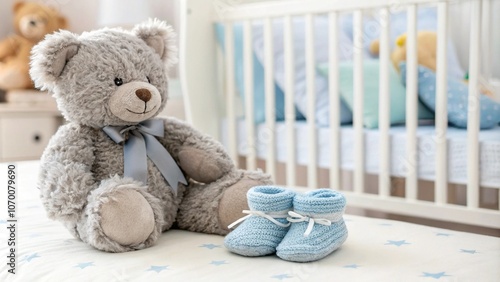 Soft teddy bear with blue knitted baby booties on a bed, with a baby crib and pillows in the background. A cozy and charming setup ideal for nursery decoration and infant themes.