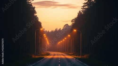 Soft warm light of streetlights illuminates a narrow forest road at dusk, illumination, forest road, rural landscape