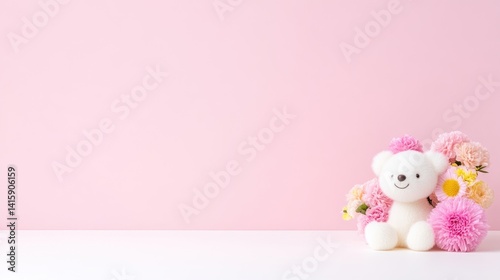 background image, design element, advertising, bear, teddy, plush, white, pink, pastel, flower, bouquet, spring, cute, gift, baby, children, girl, toy, decor, home, sitting