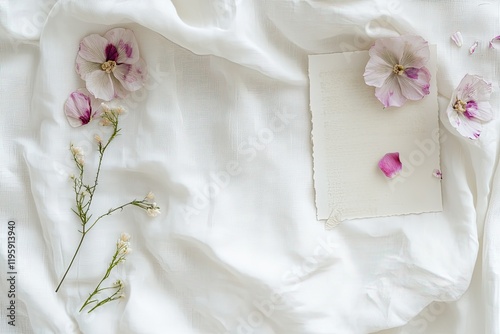 Soft white fabric adorned with delicate flowers and blank note c