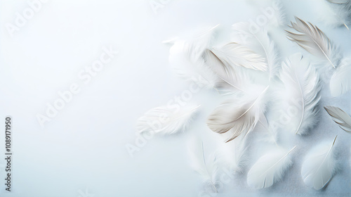 Soft white feathers scattered on light background create serene atmosphere