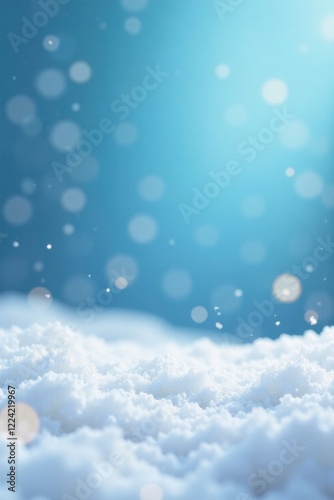 Softly falls snow on white floor with blue sky backdrop, calm, bokeh