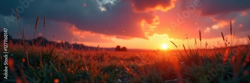 Softly glowing embers fall from the sky onto a grassy meadow at sunset, ashes, grass, sky