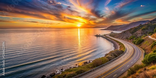 Softly glowing sunset reflected on a peaceful body of water as a winding coastal road stretches into the distance, coastal road, ocean view