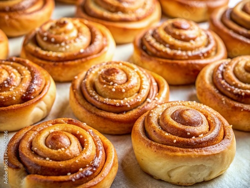 Softly lit, golden brown cinnamon rolls are artfully arranged on a pristine white background, showcasing their sweet, swirly centers in a visually appealing display.