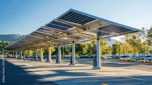 Solar energy implementation parking lot infrastructure urban environment ground level renewable power concept