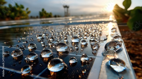 solar panel, water droplets, sunrise, renewable energy, clean energy, technology, environmentally friendly, nature, sunlight, dew, closeup, morning, energy, power, innovation, environment, sustainable, clean, solar energy, alternative energy, photovoltaic, panel, water, droplet, dripped, dawn, morning light, bright, glistening, crystal, clear, fresh, ecological, conservation, eco, global warming, climate change, earth, science, energy efficiency