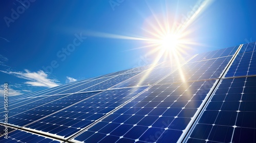 Solar panel farm in the desert with bright sunlight and a clear sky.