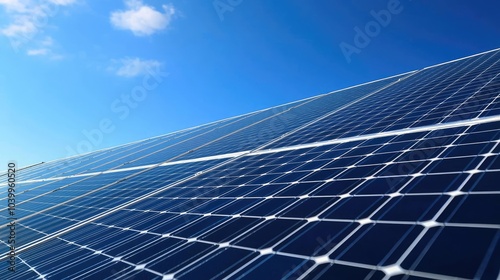 Solar panels against a clear blue sky, showcasing renewable energy technology.