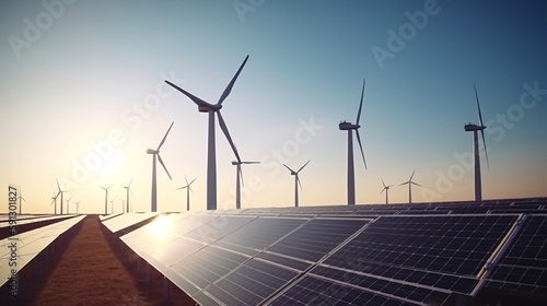 Solar panels and wind generators under blue sky . Generative ai