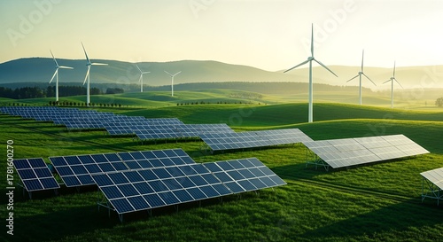 solar, panel, wind, energy, renewable, green, landscape, field, nature, environment, sustainable, power, electricity, clean, eco, friendly, sunrise, sky, cloud, horizon, outdoors, daylight, technology, innovation, future, generation, alternative, source, farm, park, hill, mountain, rural, countryside, scenic, view, beautiful, bright, light, sun, dawn, morning, fresh, air, cleanliness, ecology, conservation, global