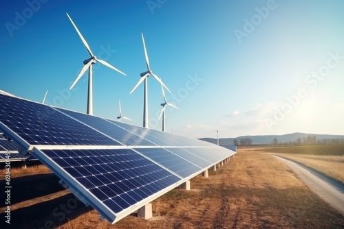 Solar panels and wind turbines produce electricity. Electric power station and renewable green energy with blue sky background Ecological energy concept