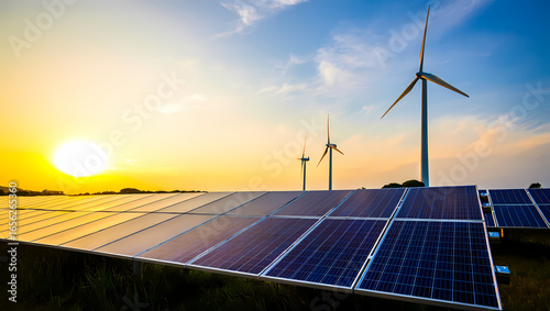 solar panel, sunset, renewable energy, golden hour, clean energy, solar energy, wind power, power generation, solar farm, wind farm, sustainable, environmentally friendly, dramatic sky, electricity, environmental, climate change, alternative energy, power plant, nature, eco, wind energy, power source, conservation, serene, majestic, landscape, horizon, cloud, futuristic, evening light, generation