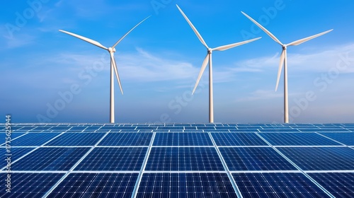 Solar Panels in the Foreground with Wind Turbines Against a Clear Blue Sky for Renewable Energy and Sustainable Solutions