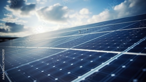 Solar panels on a photovoltaic power station against a cloudy sky on a clear day.