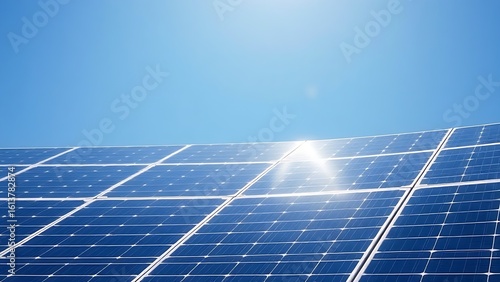 Solar panels under a clear blue sky, representing clean energy and sustainability.