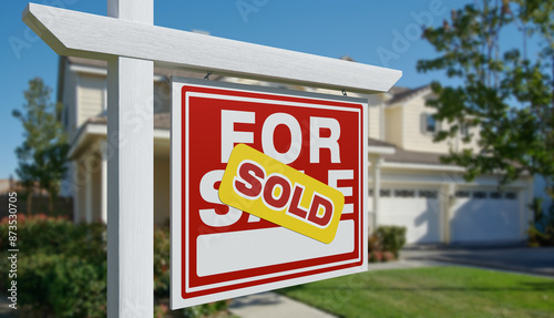 Sold For Sale Real Estate Sign in Front of Beautiful House.