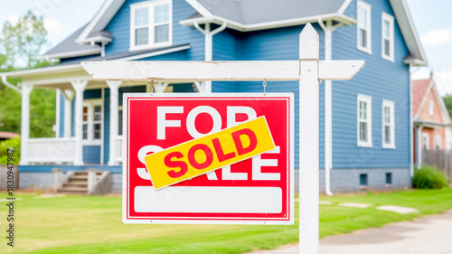 SOLD sign in front of a blue house sold real estate