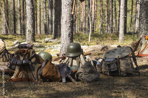 camp, backpack, scapula, spade, cauldron, bowler hat, forest, helmet, munition