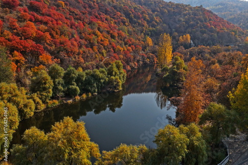 Soldier Lake. An urban lake surrounded by mountains with different vegetation. Autumn time, view from the drone.