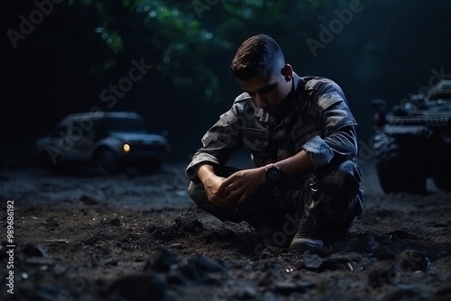 soldier, forest, night, military, solitude, vehicle, darkness, contemplation, nature, quiet, emotion, shadow, landscape, training, deployment, camouflage, ground, muddy, peaceful, serious, thought, environment, moment, outdoors, scene, wilderness, life, stillness, quietness, inner, thought, still, personal, space, uniform, mental, state, introspection, calmness, armed, force, night time, calm, emotional, connection, surrounding, operation, movement