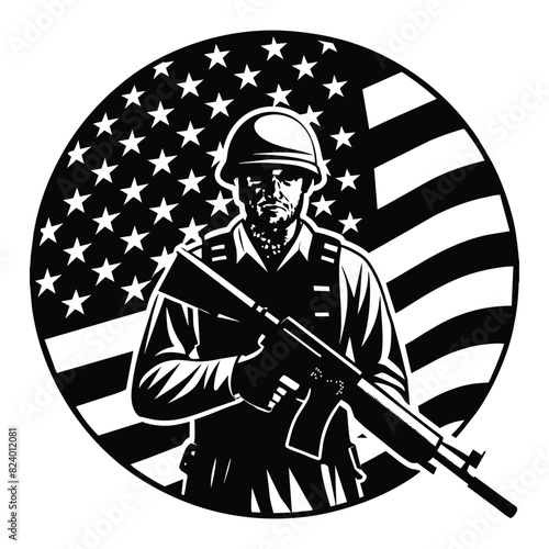 Soldier with American flag black and white color linocut vector silhouette for customize t-shirt design isolated on white background