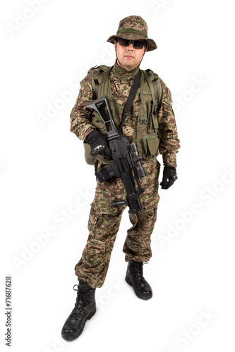 armed, army, background, camouflage, caucasian, clothing, conflict, force, green, gun, helmet, isolated, man, military, modern, 1, protection, protective, rifle, security, shot, soldier, special, studio, suit, swat, uniform, war, warrior, weapon, white