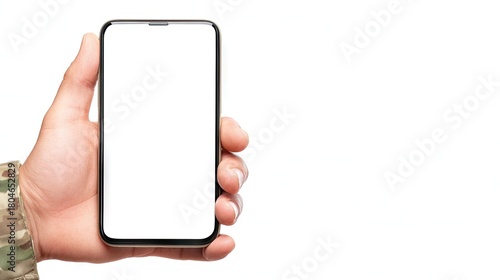 Soldier's hand holds smartphone with blank screen, symbolizing connectivity in modern military operations