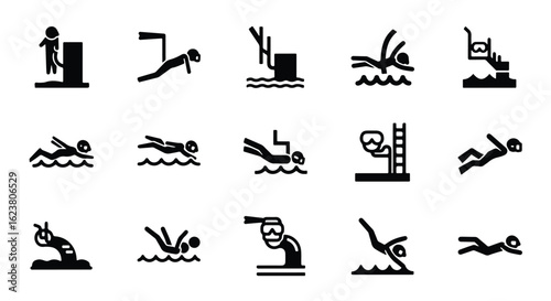 Solid black silhouette sports icon set - swimmer diving into water silhouette, isolated on white background