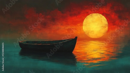 boat, water, sea, ocean, lake, sunset, sunrise, moon, sky, cloud, red, orange, yellow, dark, night, calm, peaceful, serene, tranquil, quiet, still, reflective, mysterious, lonely, solitary, isolated, mood, atmosphere, ambience, dramatic, vibrant, colourful, artwork, painting, art, image, illustration, digital artwork, landscape, scenery, nature, horizon, silhouette, shadow, colours, texture, light, darkness
