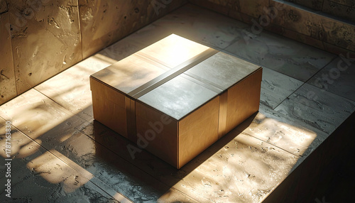 Solitary Box: A lone cardboard box bathed in the stark light of the environment, casting long, dramatic shadows across the floor, and hints at the mysteries.