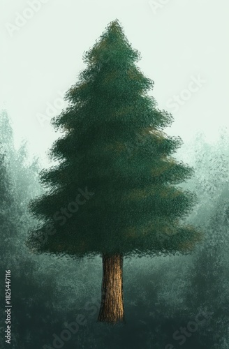 Solitary evergreen tree with textured green foliage and brown trunk against a misty forest background, calm and serene mood