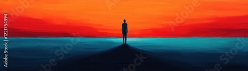 abstract, art, painting, sunset, ocean, figure, silhouette, solitary, contemplation, landscape, seascape, red, orange, blue, teal, horizon, mood, feeling, calm, serene, tranquil, peaceful, meditation, minimalist, artistic, imagery, dramatic, colourful