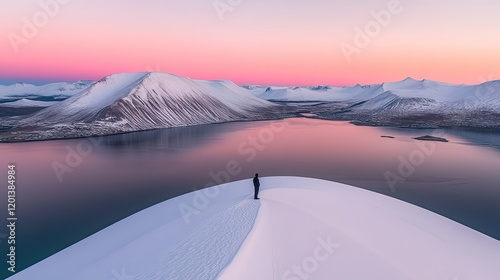 Solitary figure on snow-covered hilltop overlooking serene, pink-hued fjord and snow-capped mountains at dawn.