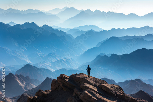 Solitary figure overlooks expansive mountain range, enveloped in misty blue hues, evoking a sense of wonder and solitude.