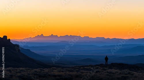 Solitary figure silhouetted against a vibrant sunset over a vast, layered mountain range.