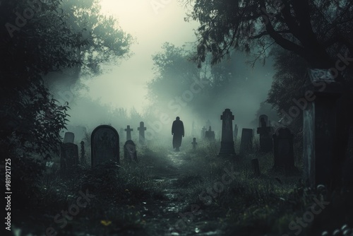 fog, cemetery, cemetery, gravestone, headstone, cross, grave, path, walk, person, figure, silhouette, misty, tree, leaf, branch, dark, skittish, eerie, mysterious, gloomy, sombre, death, afterlife, remembrance, mourning, quiet, peaceful, solitude, nature, landscape, morning, light, shadow, green, grey, black, white