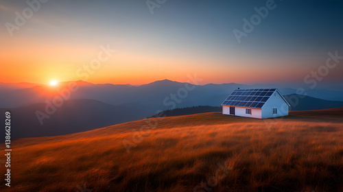 sunset, house, mountain, landscape, nature, sunrise, rural, golden hour, scenic, view, hillside, field, grass, sky, orange, red, yellow, blue, peaceful, serene, calm, tranquil, solitude, remote, isolated, distant, horizon, building, structure, architecture, bungalow, countryside, outdoors