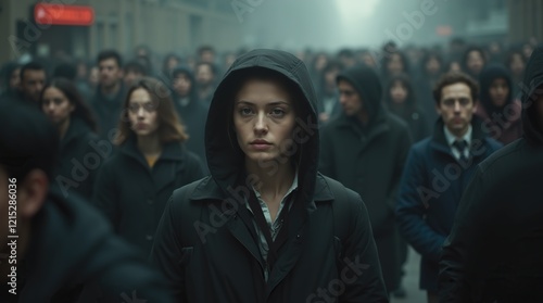 individual, crowd, urban, isolation, foggy, distinctive, loneliness, unique, contrast, standout, visibility, concept, symbolic, difference, people, person, gathering, society, sharpened, ambiguity, misty, perspective, setting, portrait, outdoors, mood, solitude, hooded, expression, atmosphere, connection, chaotic, human, plaster bandage, gathered, surrounding, mystery, identity, domination