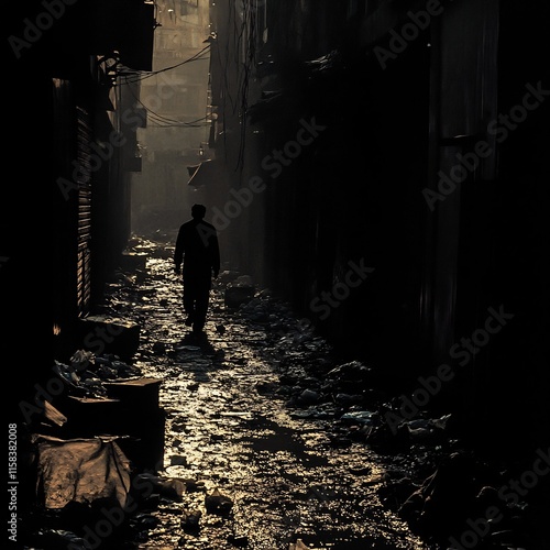 Solitary silhouette walking through a dark gritty urban alley at night