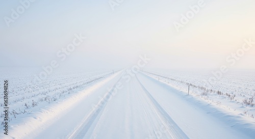 road, snow, winter, landscape, field, countryside, nature, horizon, sky, fog, mist, tire, track, path, way, route, journey, rural, outdoors, remote, prairie, morning, sunrise, dawn, cold, season, white, blue, yellow, pale, pastel, soft, light, high key, solitude, lonely, isolated, peaceful, quiet, serene, calm, tranquil, huge, empty, desolate, aethereal, atmospheric, moody, mysterious