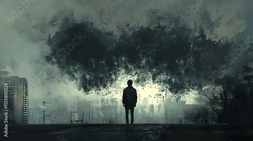 melancholy, despair, loneliness, isolation, gloom, darkness, shadow, silence, desolate, empty, lost, alone, sorrowful, brooding, contemplation, thoughtful, reflective, city landscape, urban, sky, cloud, fog, mist, pollution, smog, industrial, apocalypse, ruin, decay, derelict, abandoned, bleak, grim, dark, atmosphere, mood, feeling, emotion, human, figure, person, man, boy, back, standing